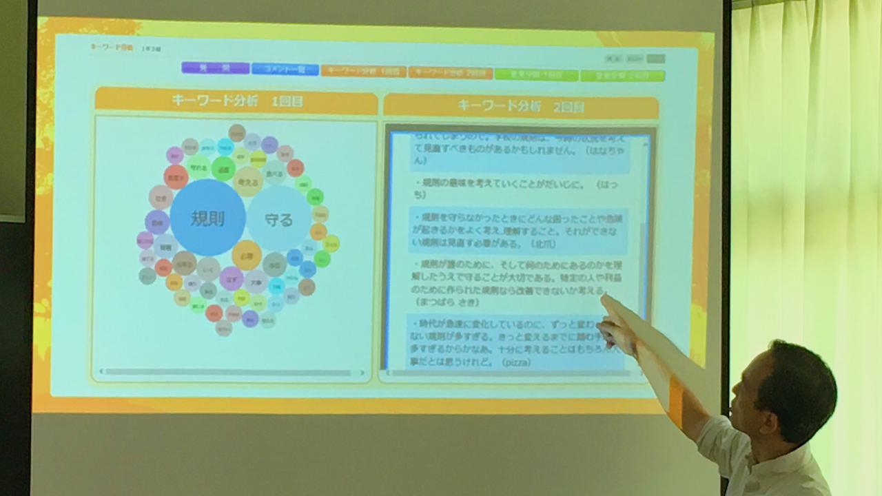 AIAIモンキーでは、児童生徒が入力した意見をコンピュータが形態素解析し、キーワードや分類を自動的に整理します。画面には意見の特徴が視覚的に表示されるため、子どもたちはキーワードを手がかりにしながら、さまざまな意見を自由に探索することができます。